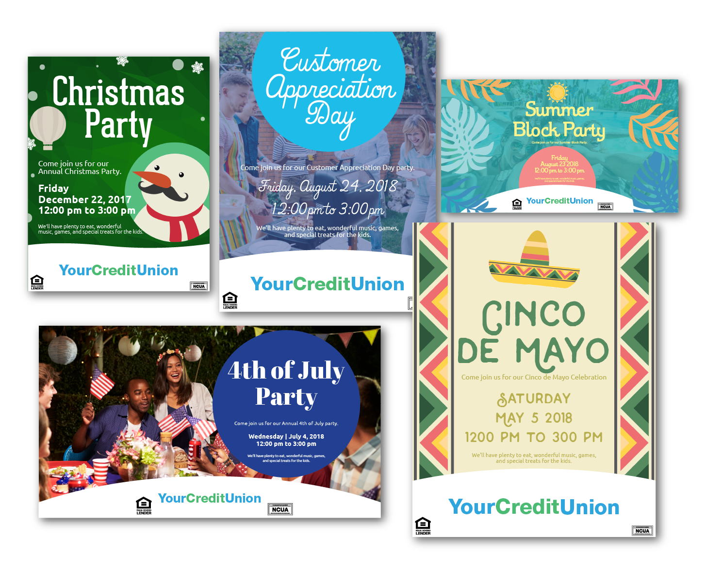 The Perfect Template for Every Event: Our platform offers a diverse library of event marketing materials; radio spots, in-branch signage, direct mailers, ads, statement inserts, and more. Each piece is expertly crafted with suggested content tailored to promoting events. Just days after joining, you’ll be creating eye-catching layouts for virtually any event imaginable.